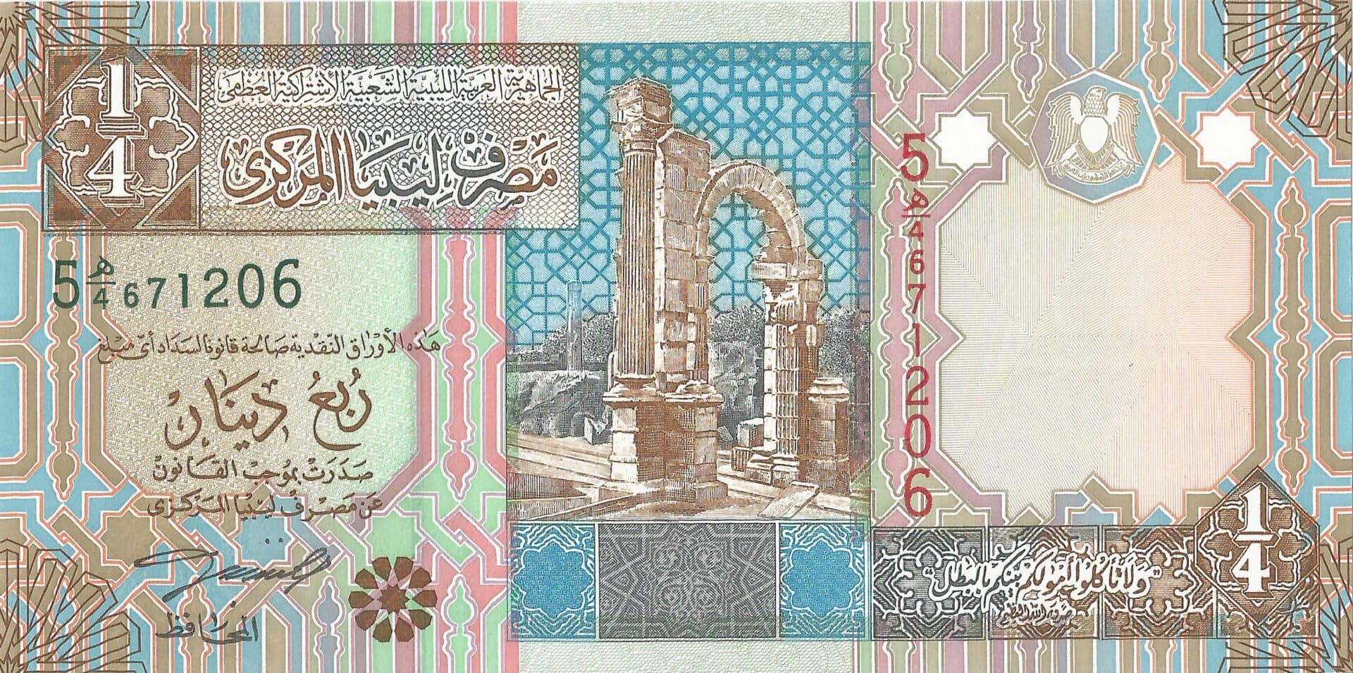 La última serie de billetes emitidos por el Banco Central de Libia fue distribuida en marzo de 2013 tras la caída del gobierno de Muamar el-Gadafi. Estos han sido totalmente rediseñados para todos sus valores (1, 5, 10, 20 y 50 dinares) de tal forma que se elimina cualquier alusión a su persona.