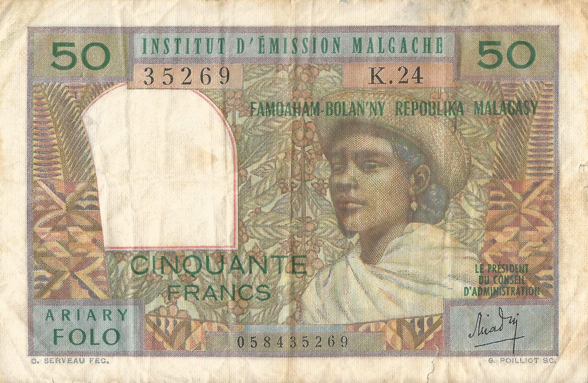 Tras la proclamación de la independencia de Madagascar, el banco central empezó a emitir nuevas monedas y billetes en 1963, con su valor ligado al del franco CFA. En 1972, bajo el gobierno militar del General Gabriel Ramanantsoa, Madagascar abandonó la zona CFA, estableciendo un nuevo franco malgache no convertible.