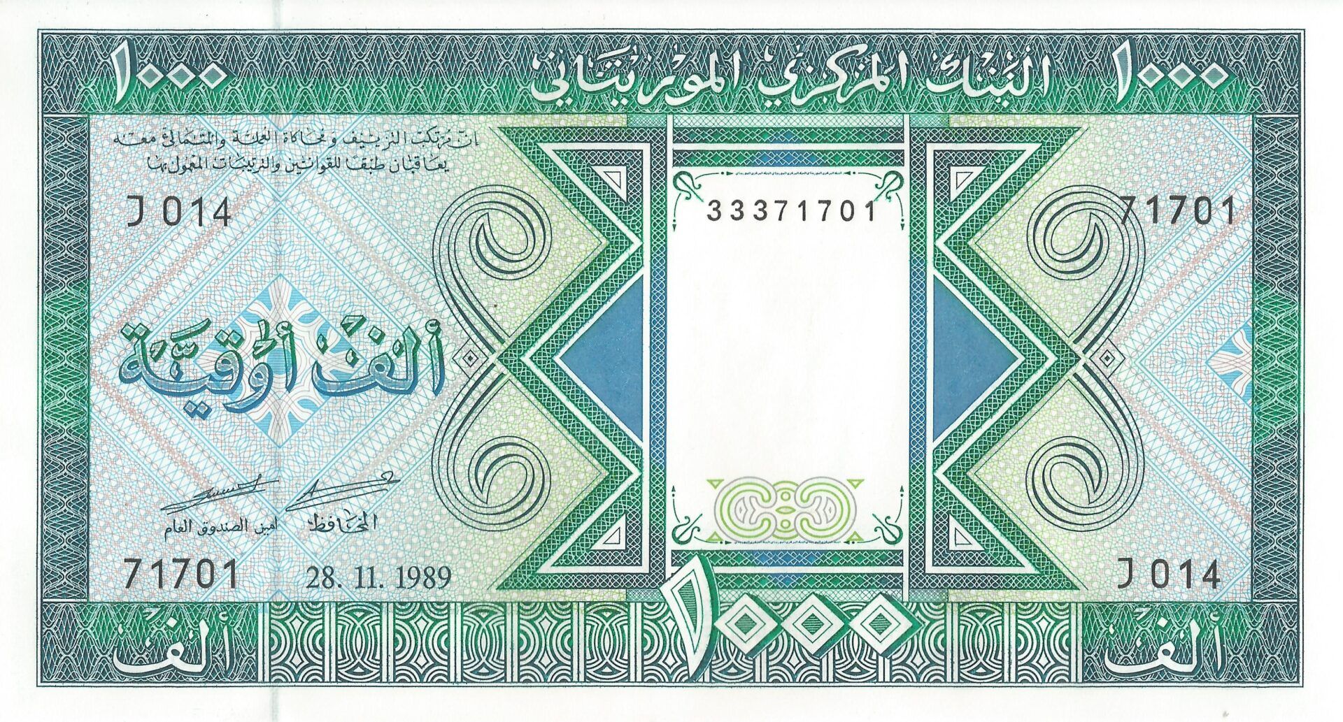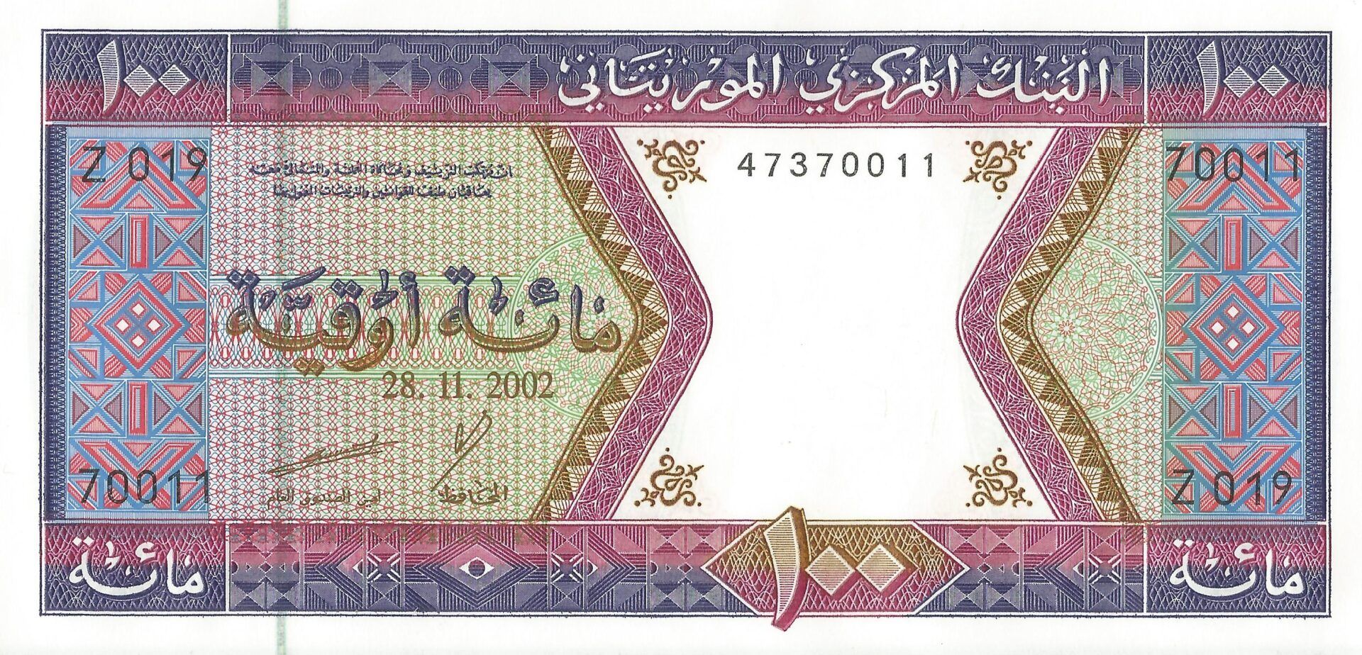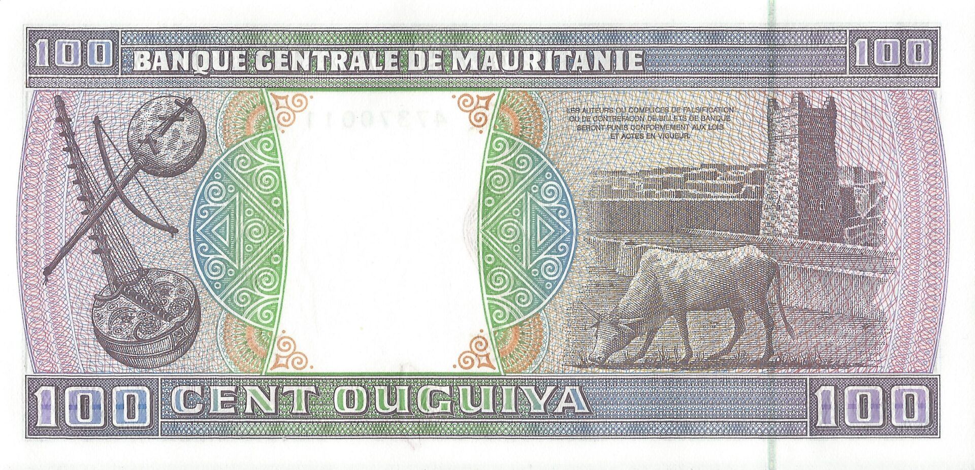 En 1973 se emitieron billetes de 100, 200 y 1.000 uguiya. En 1974 se imprimieron nuevos billetes de las mismas denominaciones, y además se introdujo el de 500 uguiya en 1979. Todos los billetes se imprimen en la Giesecke & Devrient de Alemania.