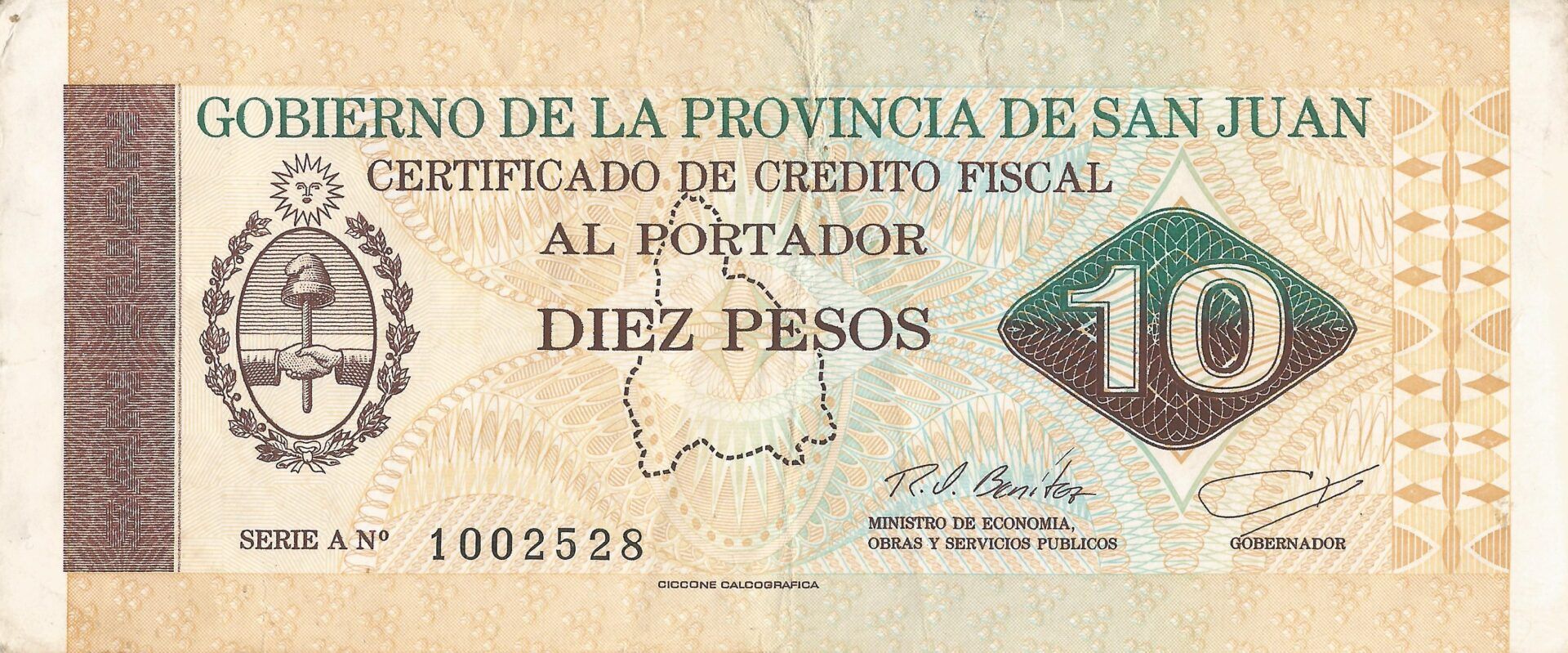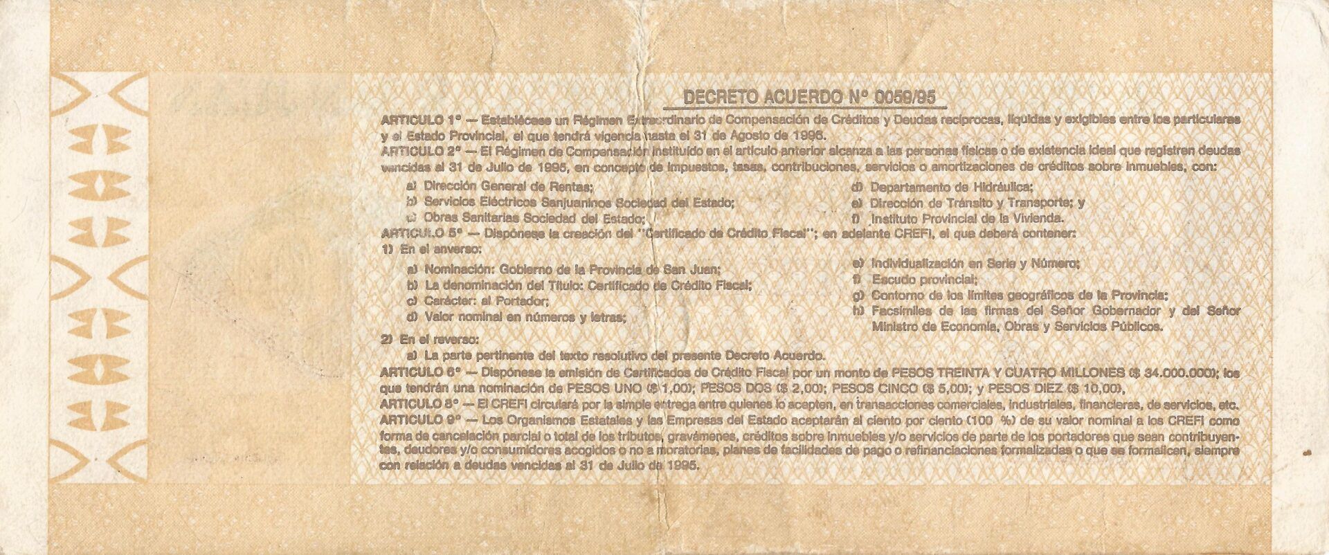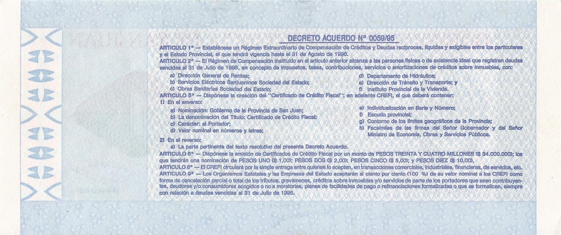 Denominados “CREFI” (Certificado de Crédito Fiscal). Impresos en Ciccone Calcográfica. Medidas 155×65 mm. En el anverso presentan el escudo provincial a la izquierda y el mapa de la provincia en el centro. En el reverso tienen una leyenda con artículos de la ley.