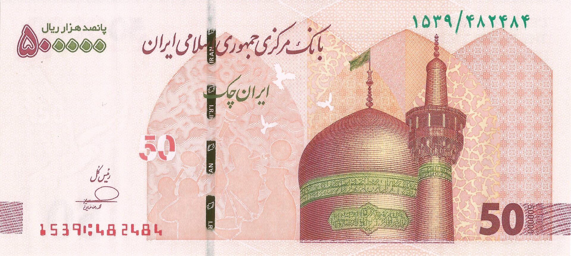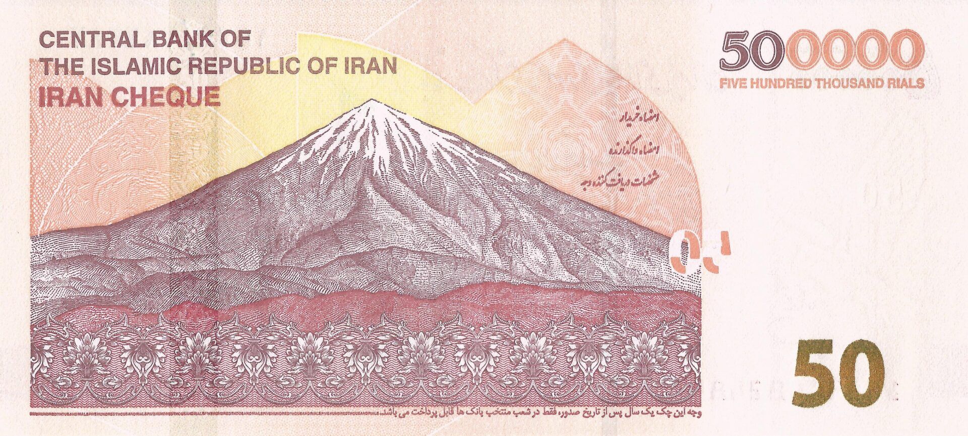 En la actualidad los billetes de mayor denominación son los de 50.000 riales. Para poder permitir el pago de cantidades mayores el Banco Central puede imprimir cheques o bonos especiales con dichas cantidades. Estos cheques tienen valor de un año, sin embargo muchos comercios no los aceptan. Hay dos tipos: los conocidos como Iran cheque, que pueden cambiarse en cualquier banco, y los que tienen que cambiarse en la institución emisora. Se emiten en denominaciones de 200.000, 500.000, 1.000.000, 2.000.000 y 5.000.000 riales.