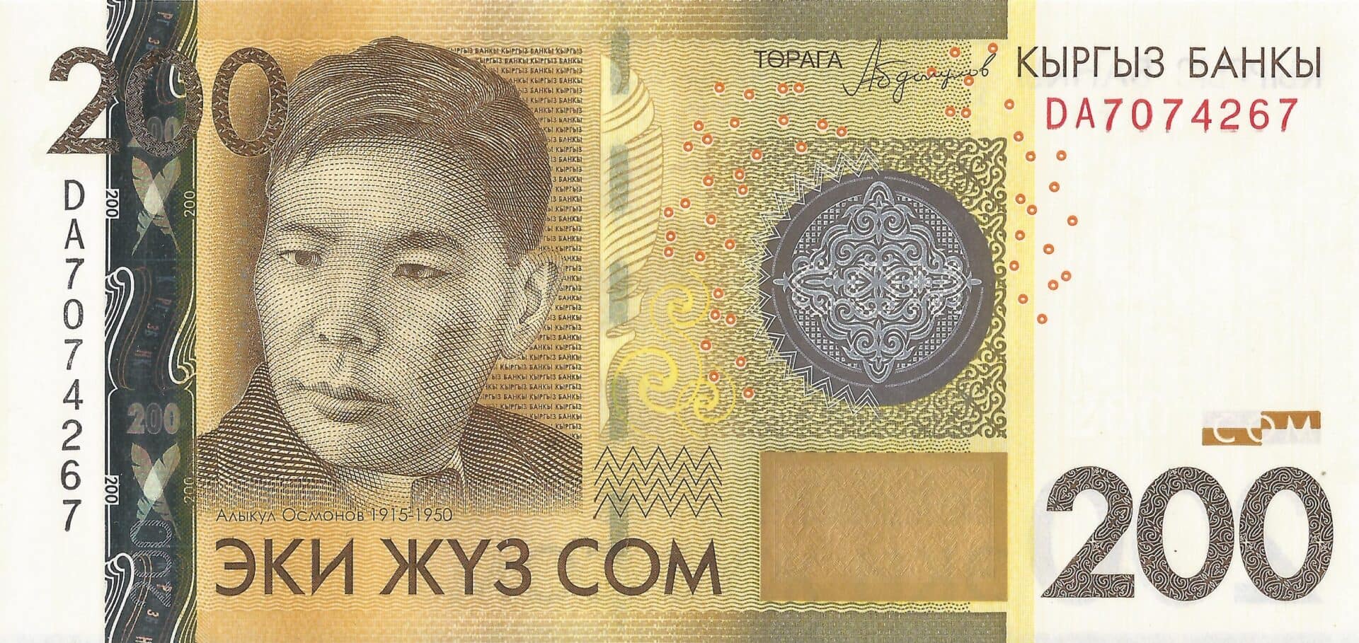El som es la moneda de curso legal en Kirguistán. El som se divide en 100 tyiyn. El som se introdujo por primera vez el 10 de mayo de 1993, sustituyendo al rublo soviético con una tasa de cambio de 1 KGS = 200 RUB.