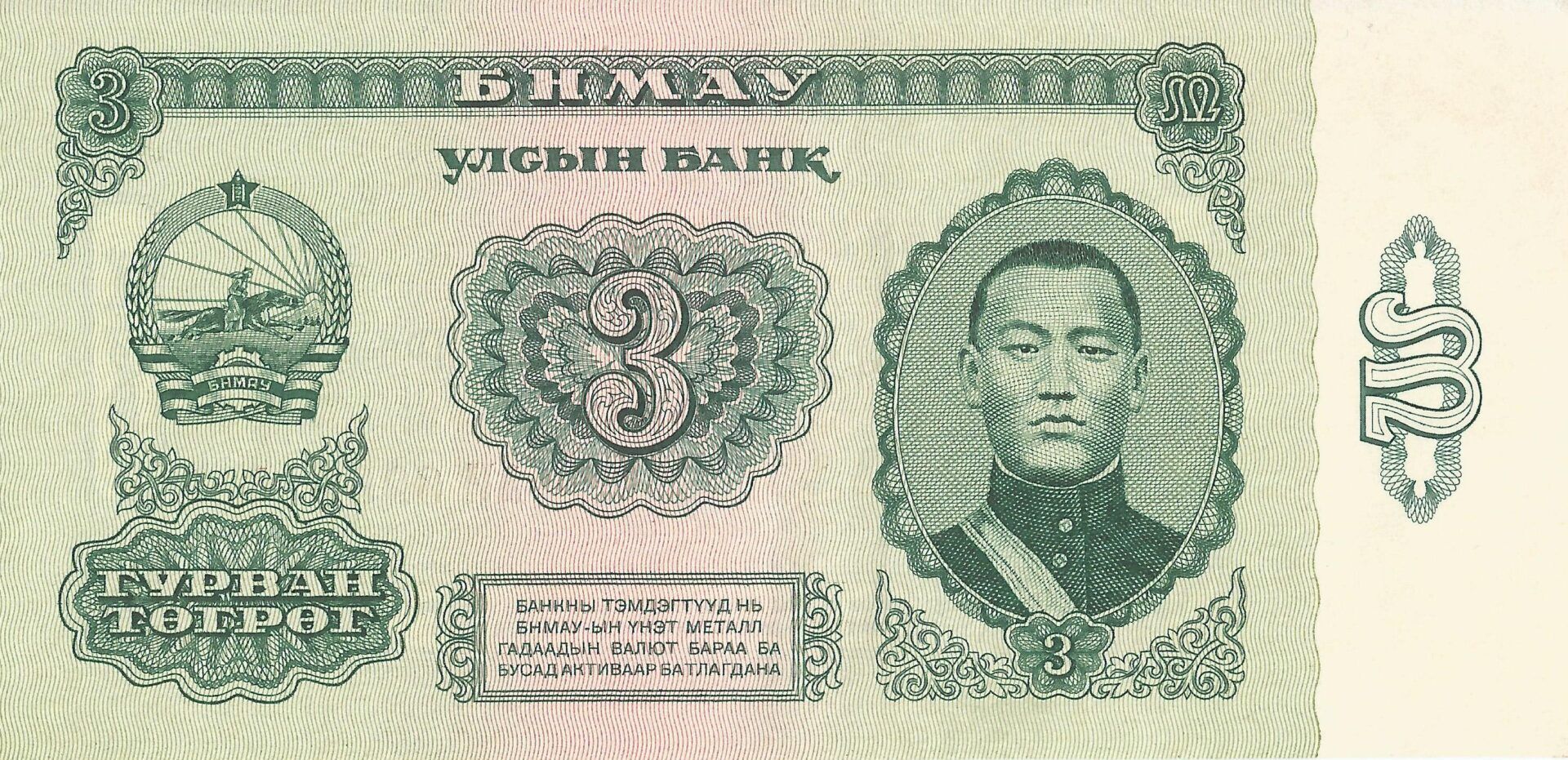 Como en el caso de las monedas, durante la época de la República Popular de Mongolia se emitieron billetes parecidos a los del rublo soviético, en las mismas denominaciones y colores. Sus denominaciones eran de 1, 3, 5, 10, 20, 50 y 100 tugrik.