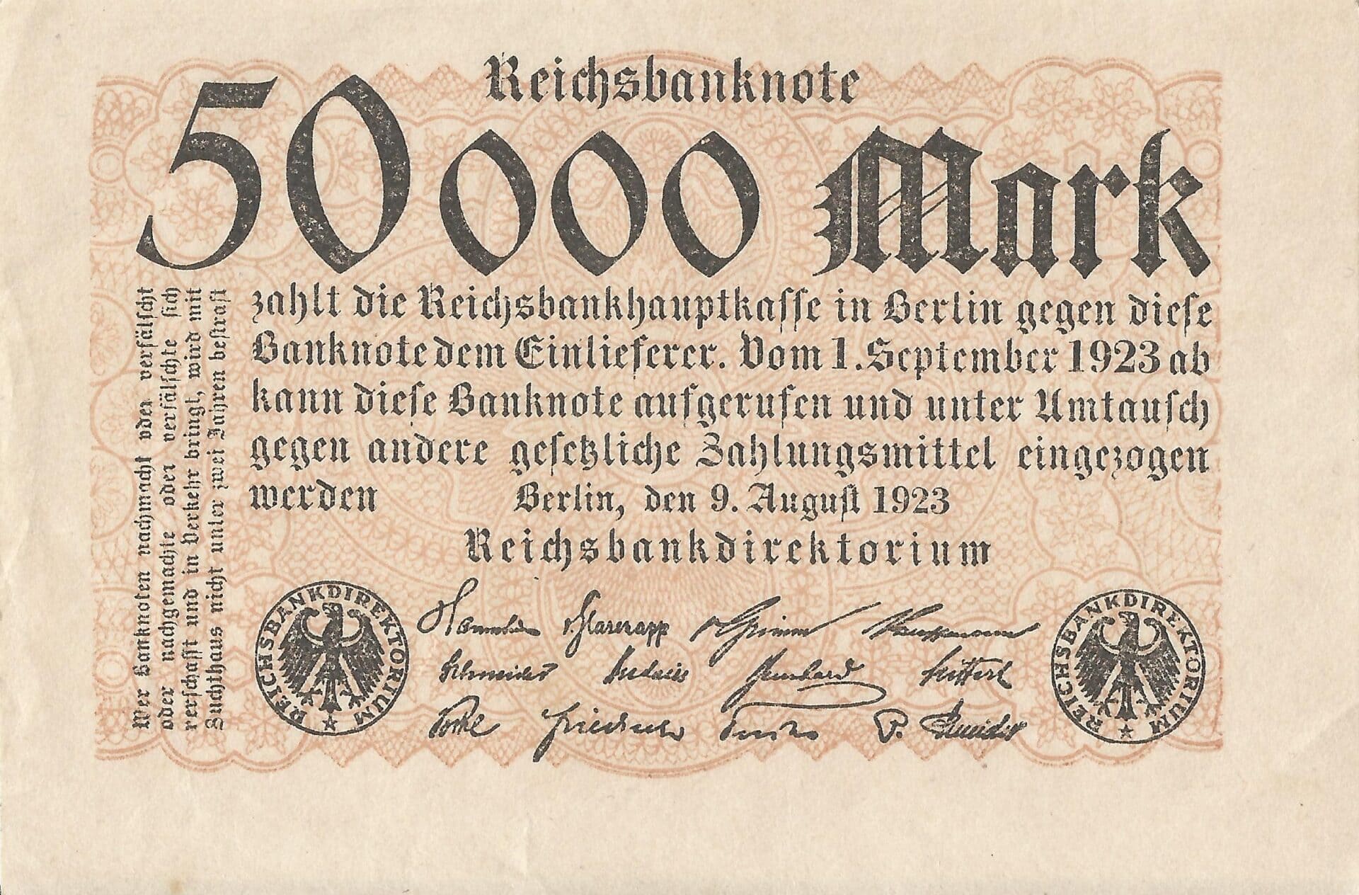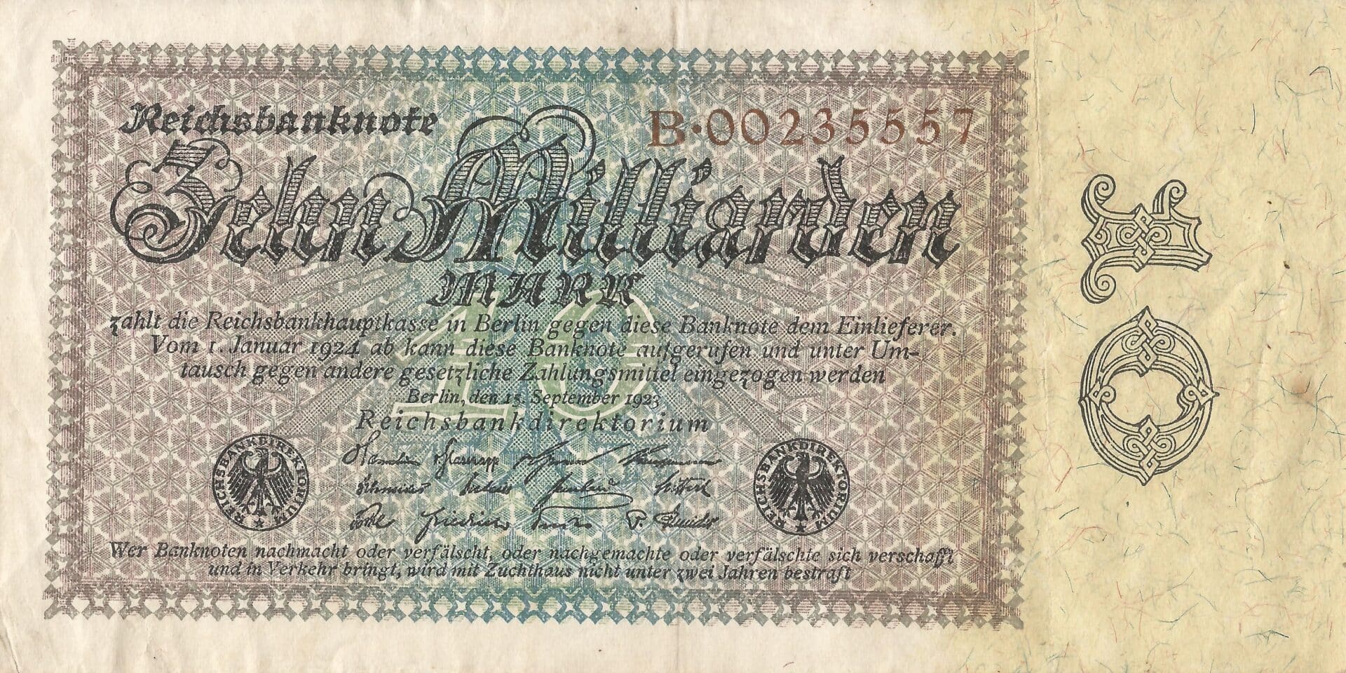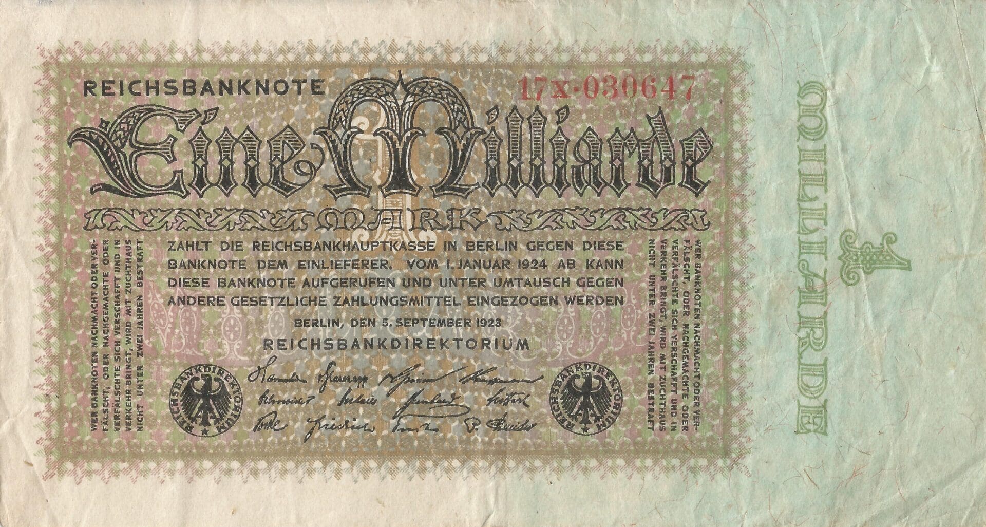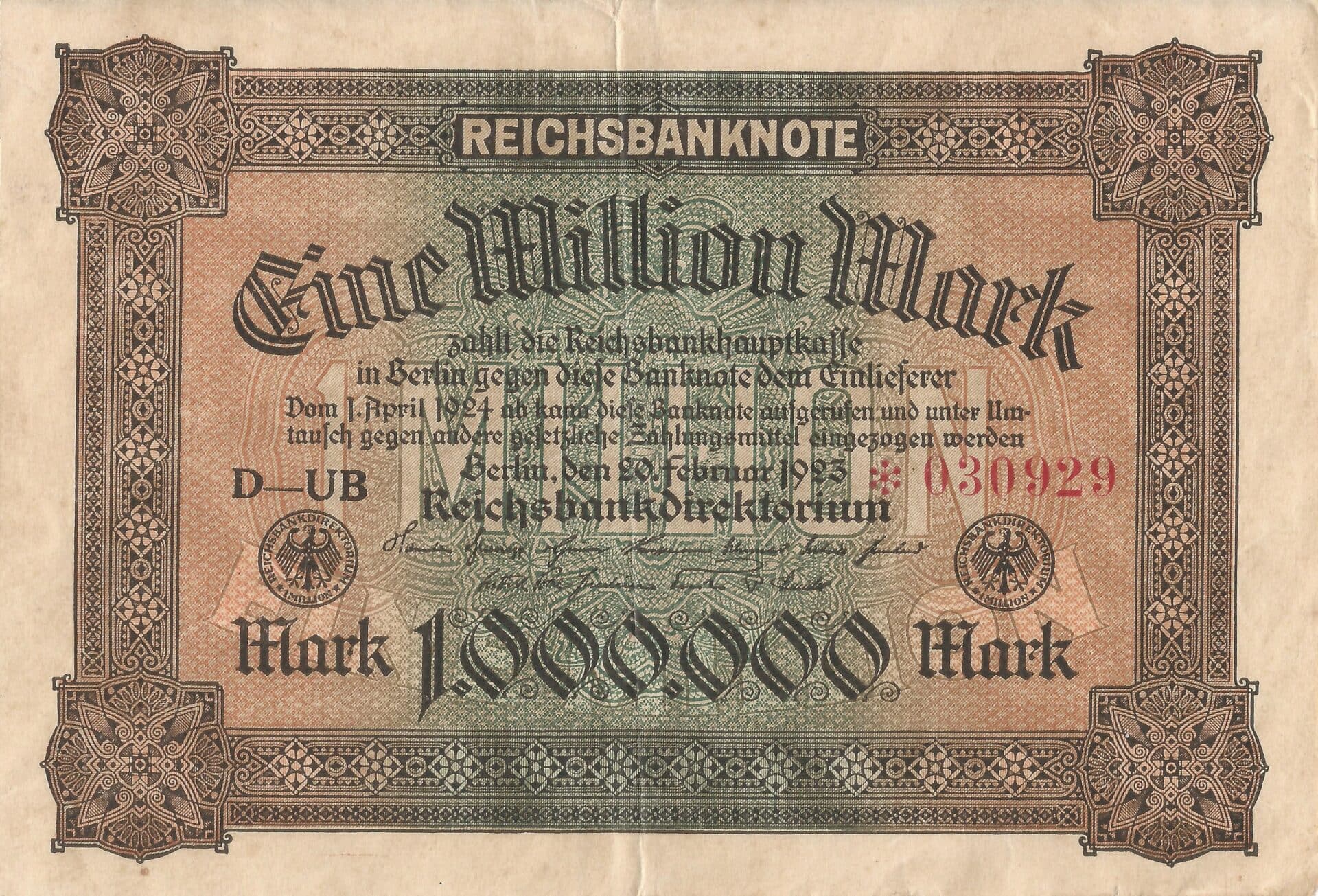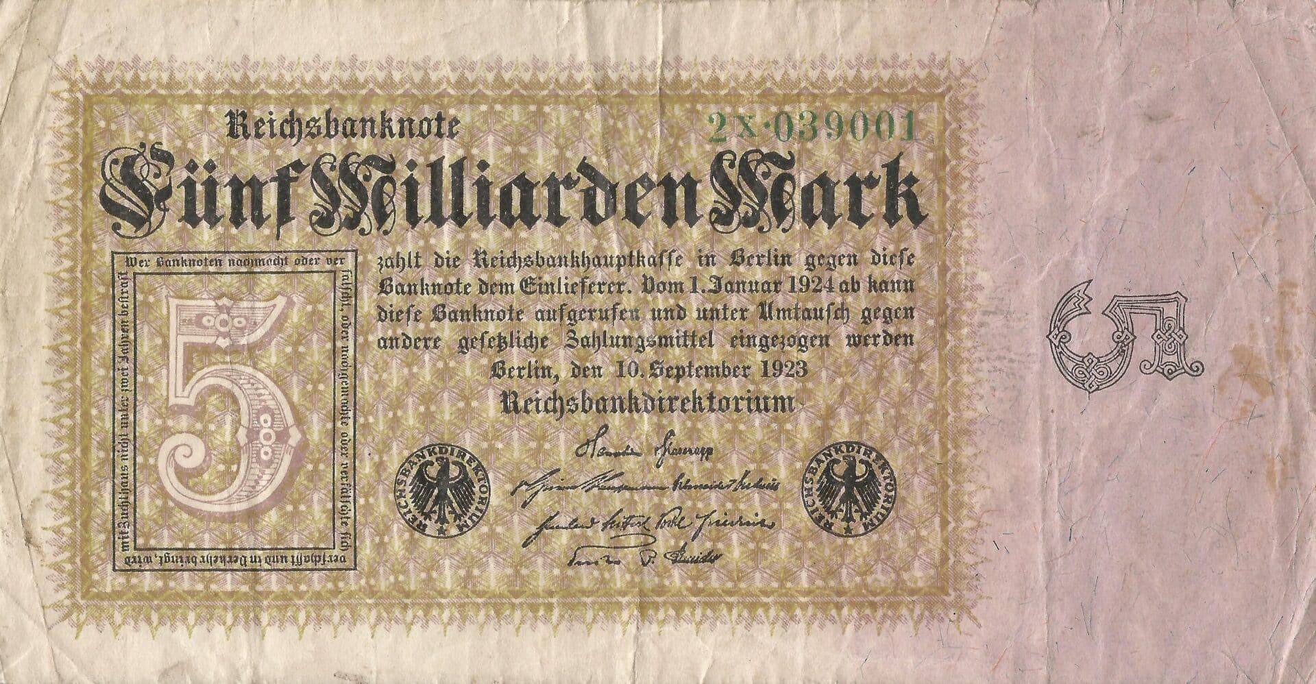 Las naciones victoriosas en la Primera Guerra Mundial decidieron reclamar a Alemania el pago por los gastos que habían sufrido para luchar contra ella. Carente de medios con los cuales pagar (ni en oro ni en moneda con respaldo de reservas), Alemania imprimió Papiermarks en forma indiscriminada hasta saldar la deuda, provocando la devaluación del marco.