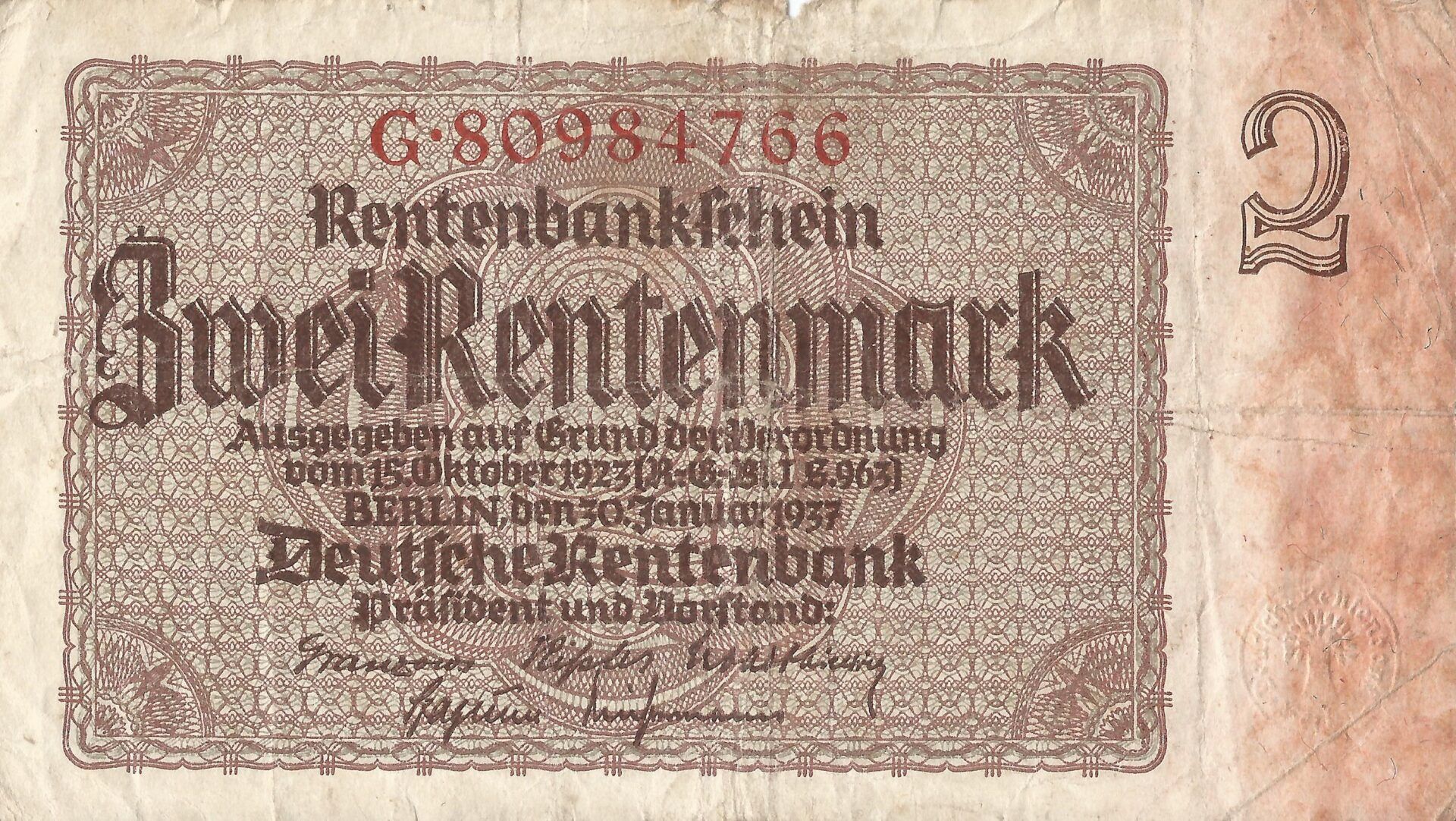 La primera serie de billetes fue fechada el 15 de octubre de 1923, y tenía las denominaciones de 1, 2, 5, 10, 50, 100, 500 y 1000 Rentenmark. Las últimas emisiones fueron: 10 y 50 Rentenmark (1925), 5 Rentenmark (1926), 50 Rentenmark (1934), 1 y 2 Rentenmark fechado en 1937.
