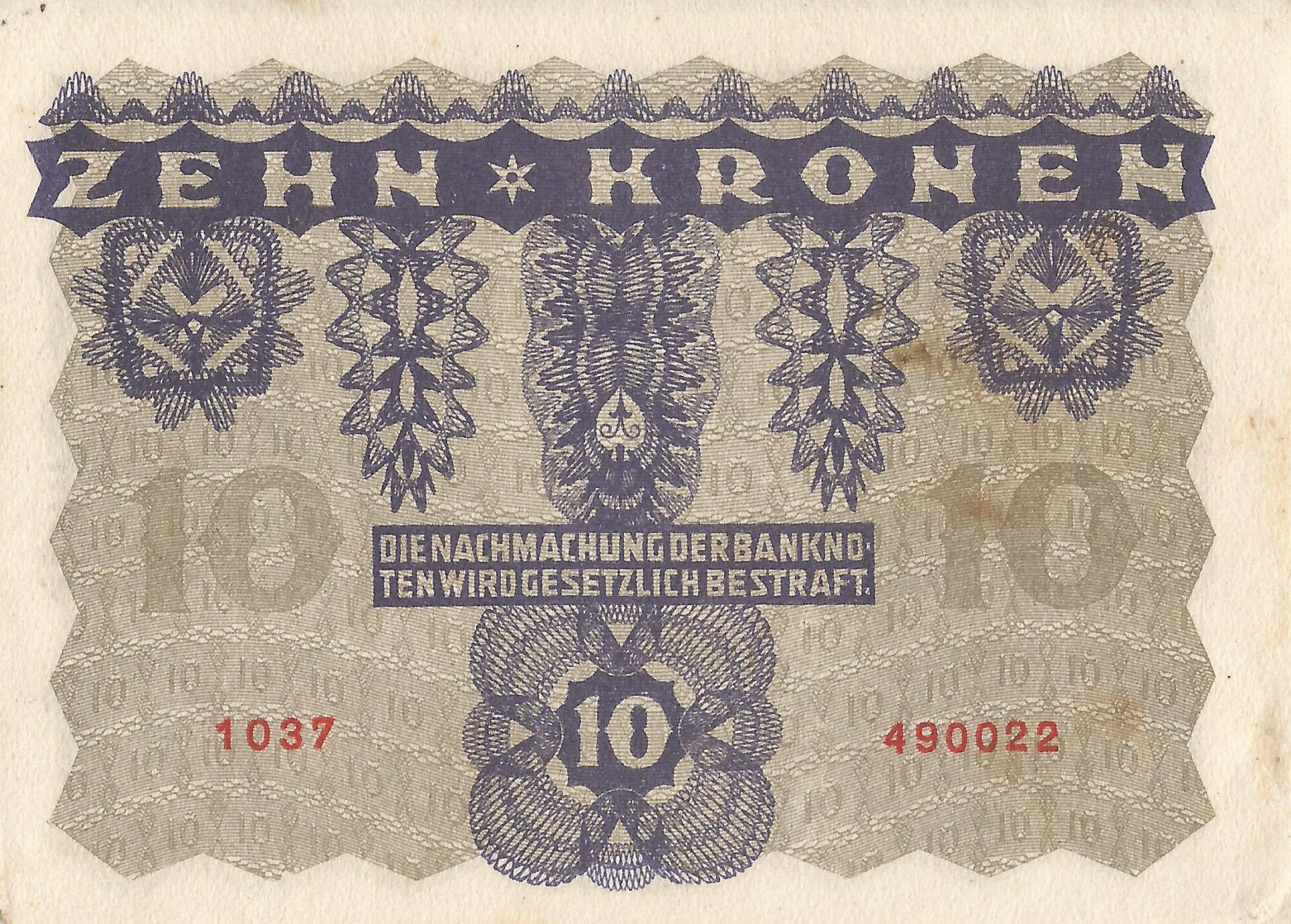 Para cumplir el primer paso, los billetes en circulación se sobreimprimieron con la inscripción DEUTSCHÖSTERREICH, y se emitieron nuevos billetes con el mismo texto. Más tarde, todavía emitidos en nombre del OEsterreichisch-Ungarische Bank, se imprimieron los billetes con los clichés de lengua alemana en ambos lados —y aún con la inscripción DEUTSCHÖSTERREICH—. A partir de 1920, apareció en los billetes un sello nuevo que rezaba: «Ausgegeben nach dem 4. Oktober 1920».