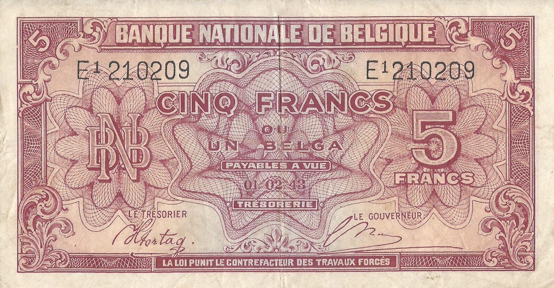 En 1944 tras la liberación, se introdujeron nuevos billetes datados en 1943, los que fueran impresos en el Reino Unido, con denominaciones de 5, 10, 100, 500 y 1.000 francos. Esta serie fue la última en tener la equivalencia en belgas. En 1948 se introdujeron nuevos billetes de 50 francos, seguidos por los de 20 en 1950, mientras que el Banco Nacional continuó emitiendo denominaciones de 100, 500 y 1.000 francos.