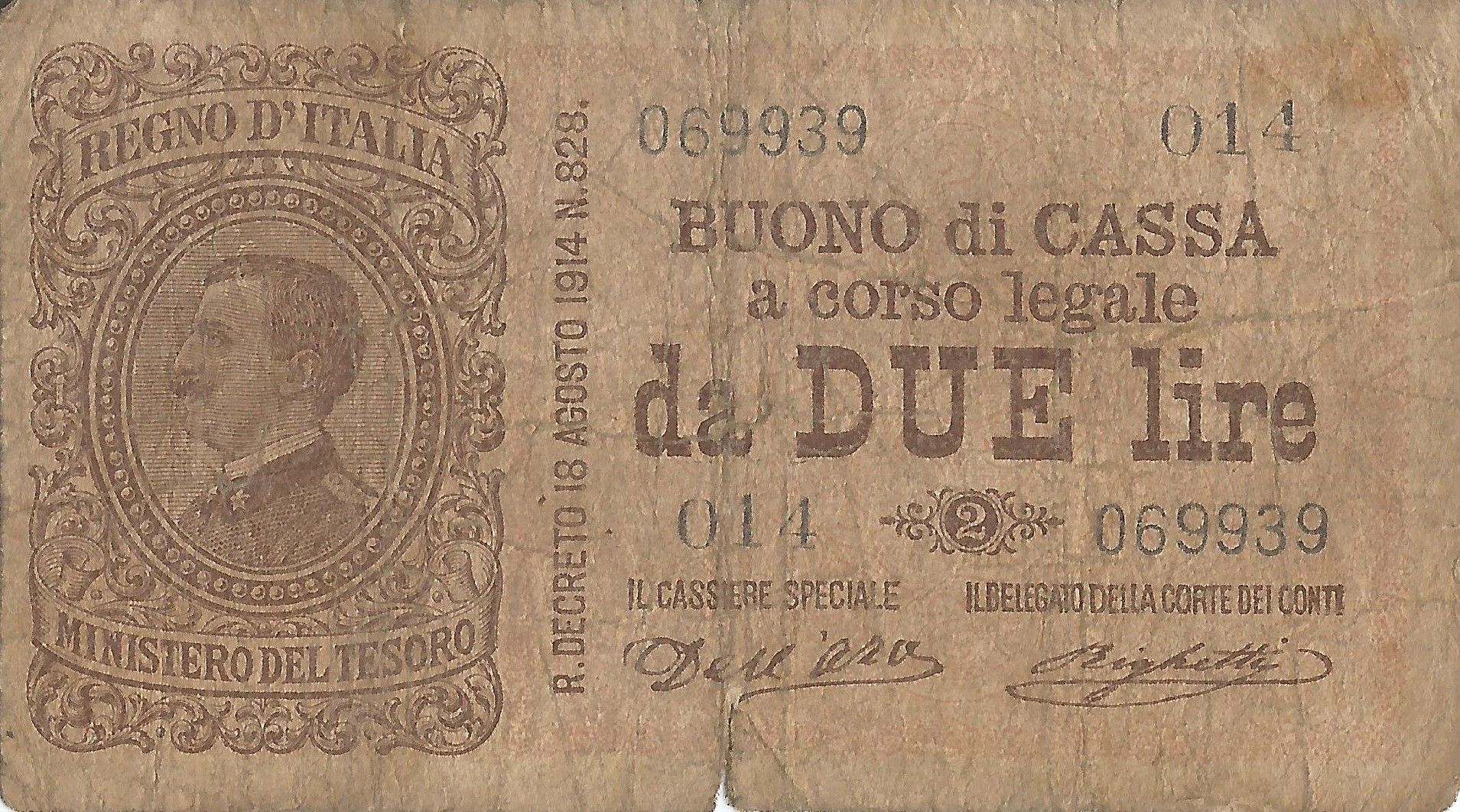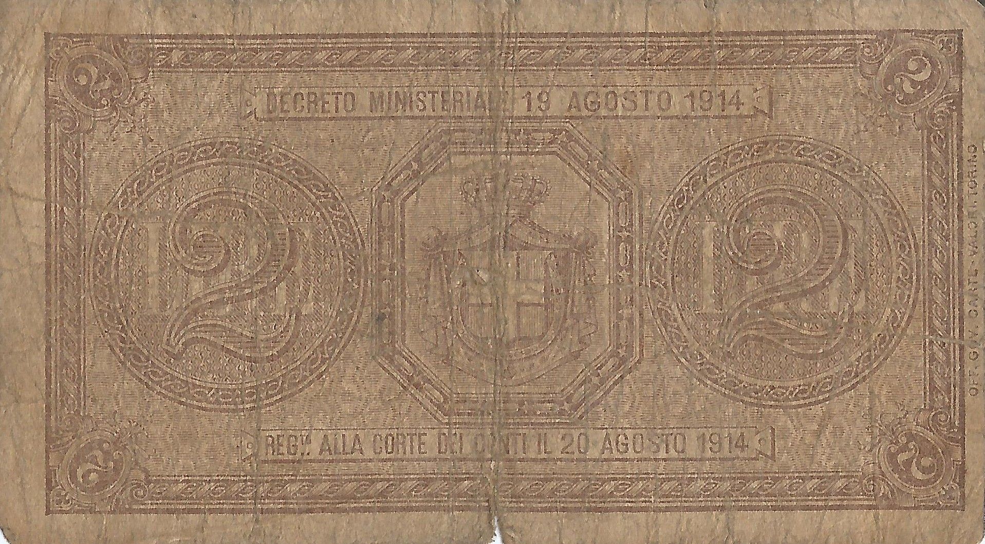 En 1882 el gobierno comenzó a emitir pequeños valores en papel con el nombre de Biglietto dello Stato. Estos se imprimieron en denominaciones de 5 y 10 liras, y ocasionalmente los de 25 liras desde 1895. También se emitieron pagarés con el nombre de Buono di Cassa entre 1893 y 1922 en denominaciones de 1 y 2 liras. La producción de los Biglietti dello Stato cesó en 1925, pero en 1935 se reanudó con denominaciones de 1, 2, 5 liras, y los de 10 liras en 1939.