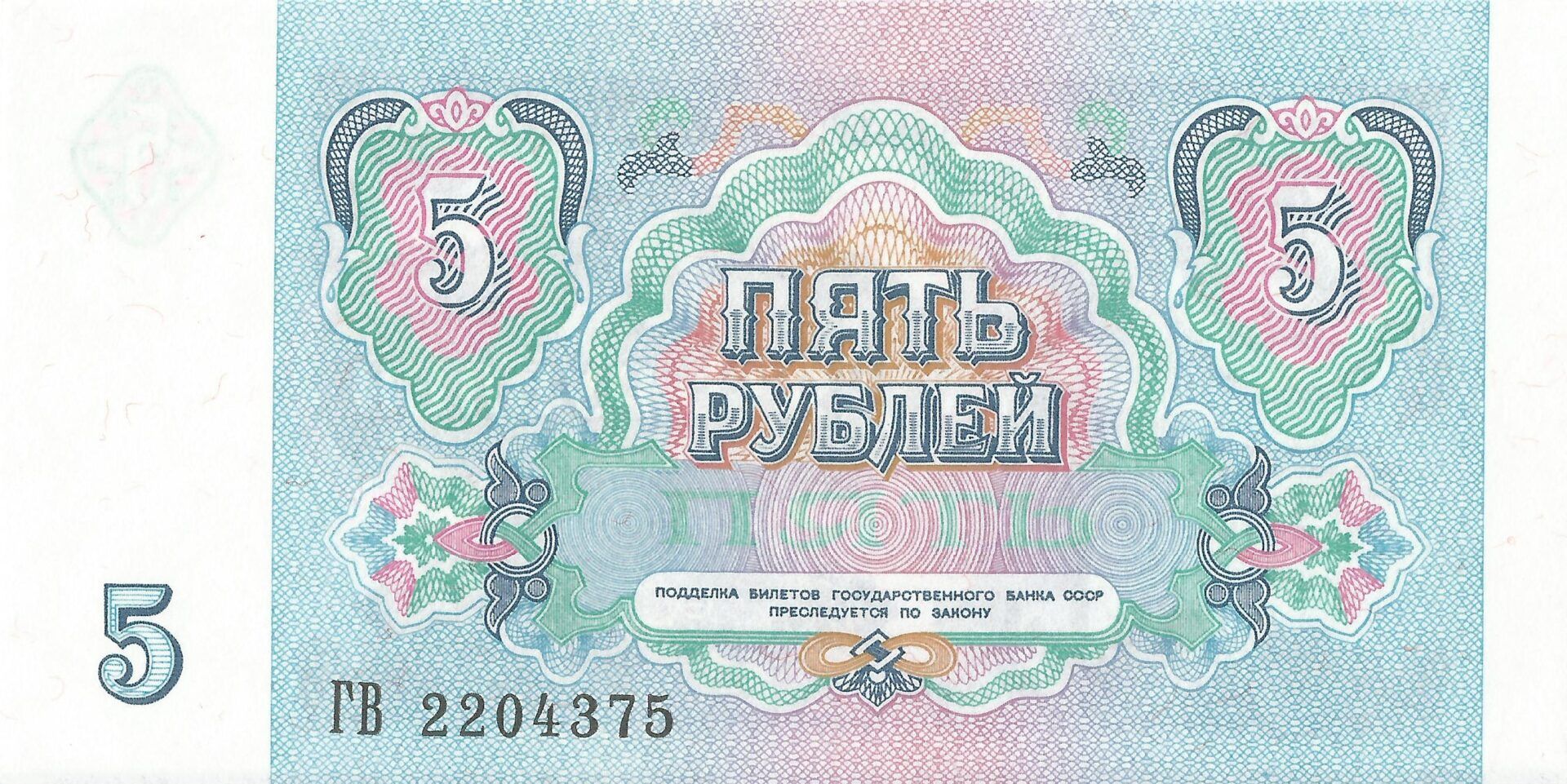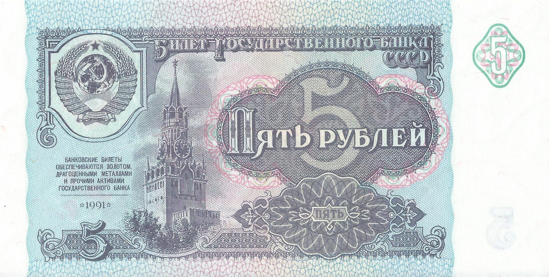 El billete de 5 rublos se encuentra cada vez menos en la circulación al ser reemplazado por la moneda de 5 rublos. Ya no se imprime, pero sigue siendo moneda de curso legal.