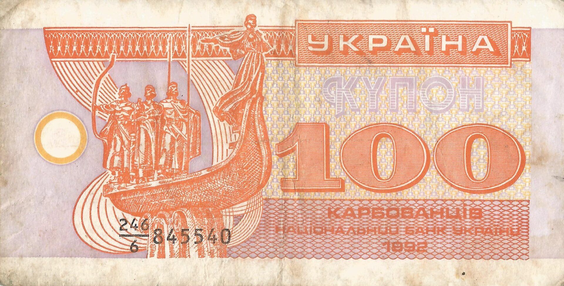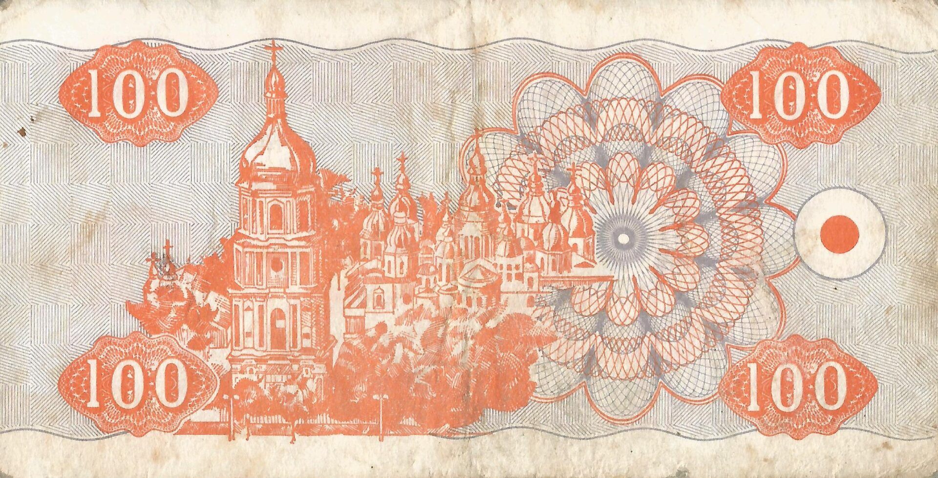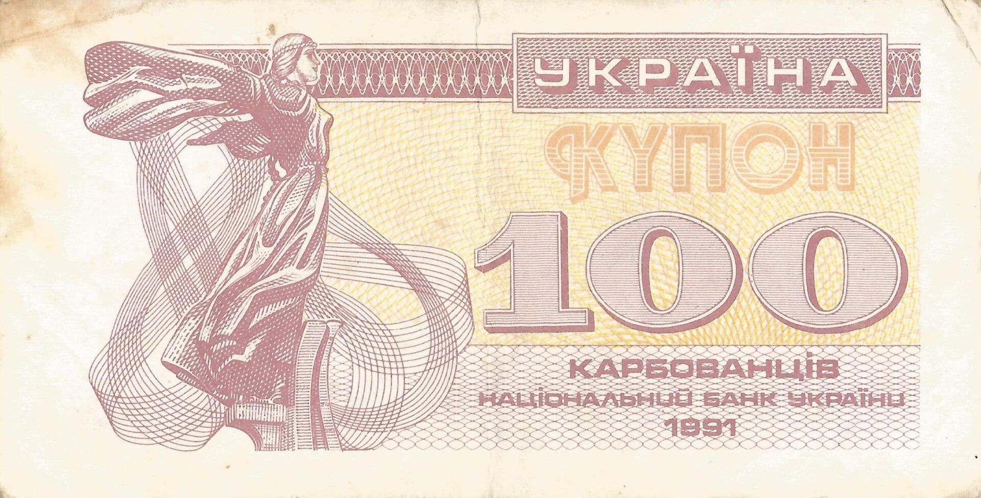 El 5 de enero de 1918 se emitió el primer billete de 100 karbovánets. El tridente utilizado en este billete fue tomado como emblema nacional de la RPU solo 54 días después de la aparición en el billete, el 1 de marzo de 1918. Solamente se imprimió una serie de billetes, la «AД», y nada más que un número de serie, el 185. Debido a que el papel utilizado para imprimir los billetes era normal (sin medidas de seguridad ni marcas de agua), pronto apareció un gran número de billetes falsos.