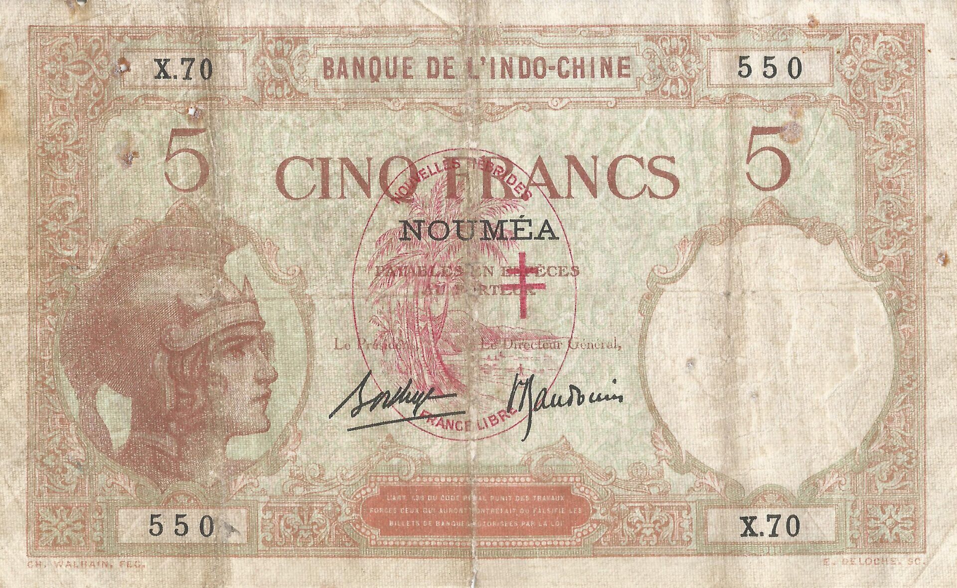 El primer billete de Nuevas Hébridas se publicó en 1921, un billete de 25 francos de la Comptoirs Français des Nouvelles Hébrides (Puestos de comercio francés de las Nuevas Hébridas), con fecha 22 août (agosto) de 1921. Es muy raro y son muy escasos. Nuevas Hébridas comenzó a emitir billetes de nuevo en 1941. Estos fueron billetes del Banco Central de Indochina sobreimpresos con un sello distintivo, sus denominaciones eran 5, 20, 100, 500 y 1000 francos. Las mismas denominaciones se emitieron en 1943 por el Comptoirs Français des Nouvelles Hébrides.